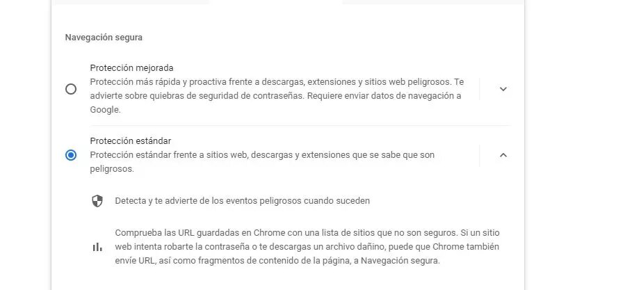 Activada por defecto tendrás la “protección estándar” que, según indica Google, “protección estándar frente a sitios web, descargas y extensiones que se sabe que son peligrosos” y añade una serie de datos extra que nos indica qué hace: comprueba las URL, detecta y advierte de eventos peligrosos… Pero justo encima de esta protección estándar veremos una mejor: Protección mejorada.