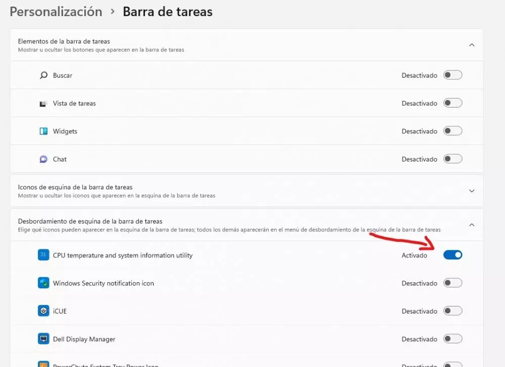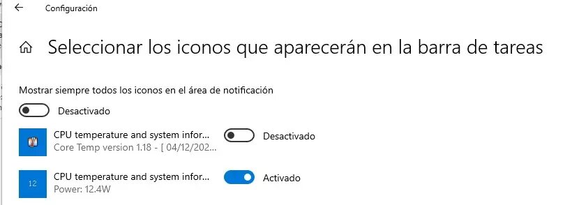 Esto que te hemos explicado es para Windows 11. En Windows 10 es exactamente igual hasta que entras en «Configuración de la barra de tareas», pero la diferencia es que lo que debes buscar es "Seleccionar los iconos que aparecerán en la barra de tareas". Aquí además podrás desactivar que se vea el icono de Core Temp, de forma que se vea solo el del sensor de consumo.
