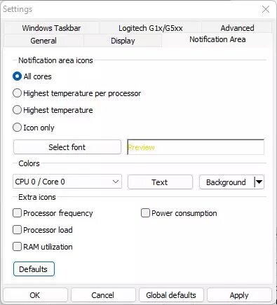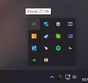 Lo que debes hacer es marcar la opción de abajo "Power consumption", pero al hacerlo verás que automáticamente aparecerá una gran cantidad de números en el área de notificación de Windows, al lado del reloj, concretamente una por cada núcleo de tu procesador; como tampoco queremos que se nos llene el área de notificaciones de numeritos, lo que debes hacer ahora es marcar la opción "Icon only" en la parte de arriba de esta ventana en la que estábamos. De esta forma, solo se mostrará un número, que como ya habrás adivinado corresponde a la cifra en vatios de cuánto consume tu procesador en cada momento. Hecho esto, pulsa sobre Apply y listo.