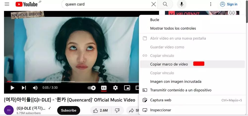 Si utilizas Edge, la mala noticia que te tenemos que dar es que el sistema es exactamente igual a Chrome. Lo único que cambia es que la opción no se llama «Copiar fotograma», sino que aparece con el nombre de «Copiar marco de vídeo». Una vez la has elegido, también tendrás que ir al programa de imagen y «volcarla» para poder recortarla o guardarla tal cual.