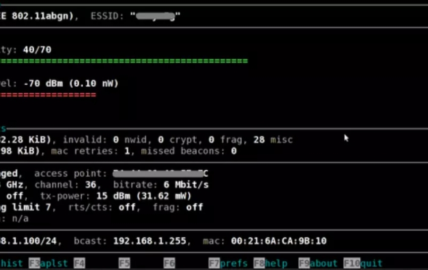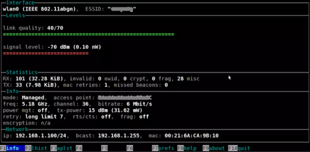 Once we have made the console screen larger to perfectly adapt to the program, we run the command again in the terminal, and we will automatically monitor all the values of the Wi-Fi link to which we are currently connected. The information that will appear in the console when we execute Wavemon is the following: