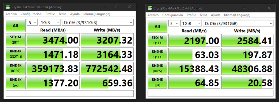 In terms of performance, the read and write speeds are limited by my motherboard, but still, max out what my PC is capable of. PNY does not offer concrete data on moving files from alt to definition, but from the tests with CrystalDiskMark 8 on these lines, it seems that it defends itself quite a bit. Of course, its numbers are much higher than the Sandisk Extreme Pro NVMe 1TB that I use in the other slot as the main unit and whose analysis will come soon..