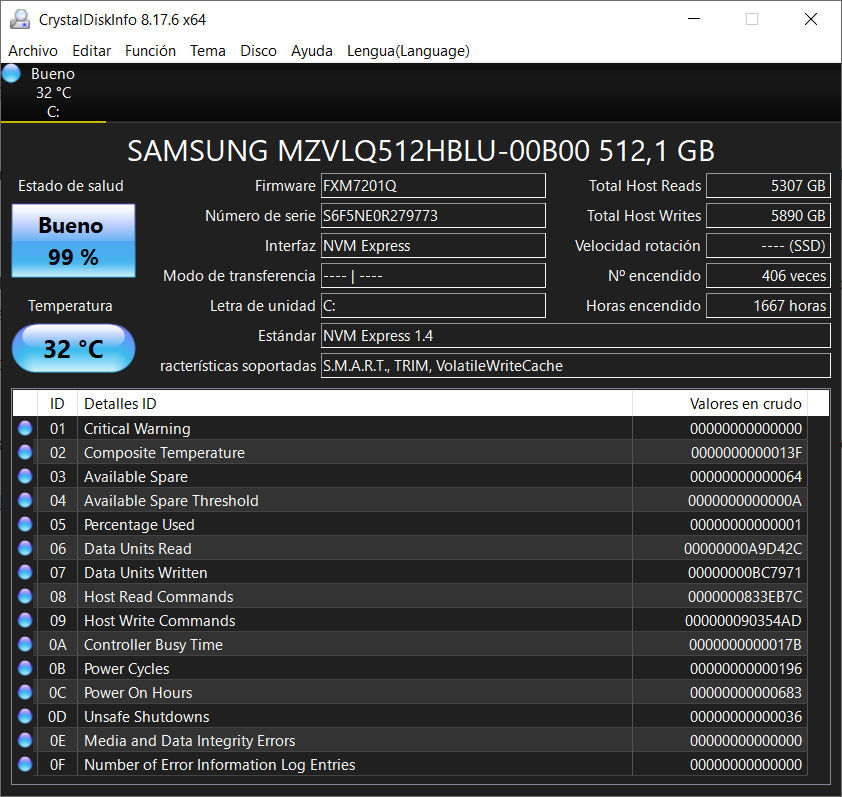 In it we will see a lot of information, such as the specific unit installed, which in this case corresponds to an SSD that Samsung sells to OEMs. We will also see the version of the NVMe protocol used or the supported features that are important in this type of drive, such as TRIM or SMART.