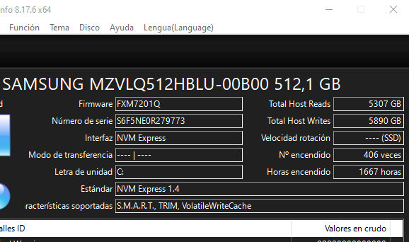 For the example, we have used a laptop where we install and uninstall systems and applications many times for the tests that we offer you. It is almost a couple of years old and as you will see in the image those 5890 GB are very far from the 700 TBW that we take as a reference.