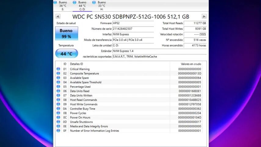 • Another piece of information that is very interesting, in the case of SSDs, is where it says Total Host Writes (upper right), since it is the data that has currently been written on said storage hardware.