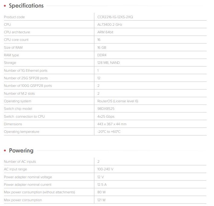 Link: https://www.servethehome.com/mikrotik-ccr2216-1g-12xs-2xq-readied-as-a-25gbe-and-100gbe-router/