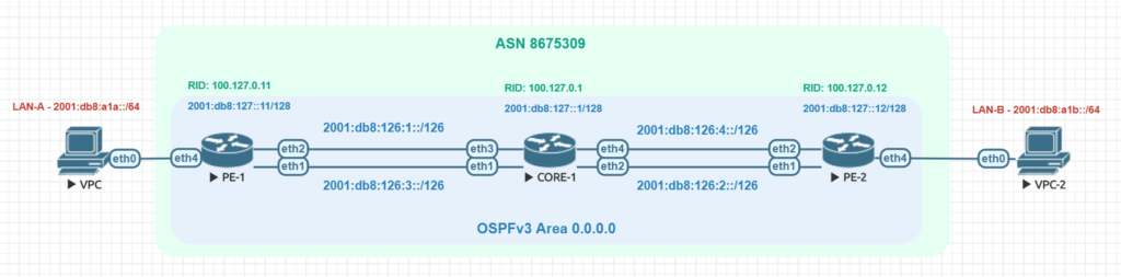 Using a lab based on EVE-NG, we’ll take a look at configuration changes and iBGP using the IPv6 AFI with OSPFv3 as the IGP for loopback/next hop reachability. Prior to 7.1beta2, this has been nonfunctional for years due to routing recursion limitations.