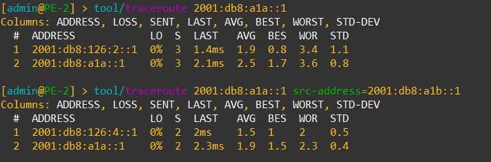 Here is a test from PE-1 to PE-2 (2001:db8:101::12) using iBGP.