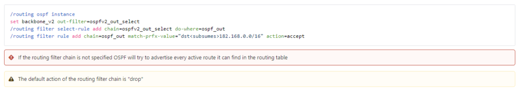 One of the first major challenges I had to solve when working with ROSv7 was figuring out why every route available became advertised into OSPF.