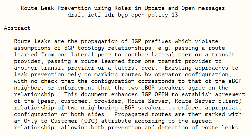 draft-ietf-idr-bgp-open-policy-13 – Route Leak Prevention using Roles in Update and Open messages