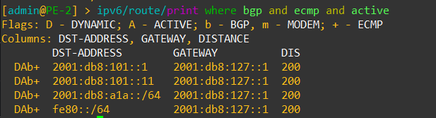 ECMP capable IPV6 routes in BGP noted by the new “+” symbol in the routing table for ECMP.