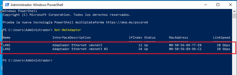 We open a PowerShell with Administrator permissions and execute the command Get-NetAdapter this command shows us the network interfaces that we have available: