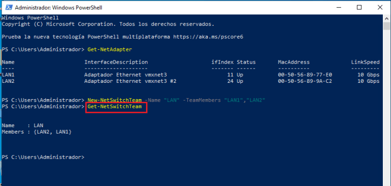 To create the NIC Teaming we execute New-NetSwitchTeam -Name “LAN” -TeamMembers “LAN1”, ”LAN2”: