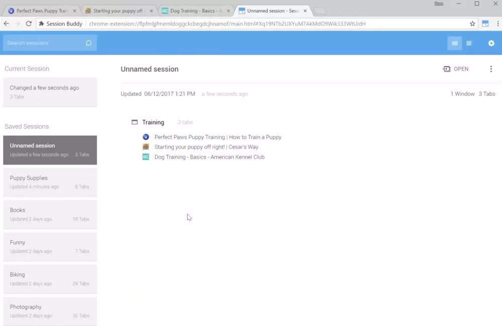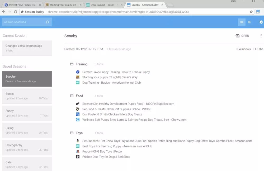 Session Buddy bases its interface on an overview that takes an x-ray of all the content that is open in Google Chrome at that moment. In the home page, all the tabs open at that moment are collected . So, if we open many windows and, in each of them, different tabs, we will see this same distribution when accessing the extension, as shown in the following image.