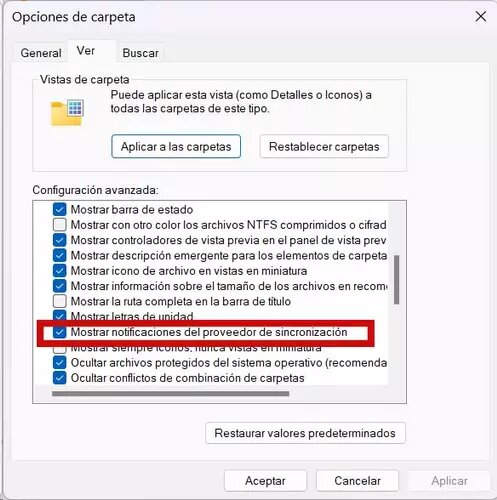 Once in this menu, in the Folder Options window choose the “View” tab and uncheck the box next to “Show notifications from sync provider”. After that, click “Apply” and then “OK” so that the changes to these settings are saved.
