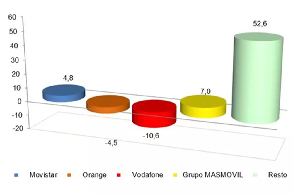 On the other hand, as we can see in the previous graph, Orange (-4.5) and Vodafone (-10.6) are negative with respect to the monthly gain of fixed broadband lines in February of this year. Movistar adds 4.8; the MásMóvil 7 Group (counted in thousands). Compared to 52.6 for the rest of the MVNOs.