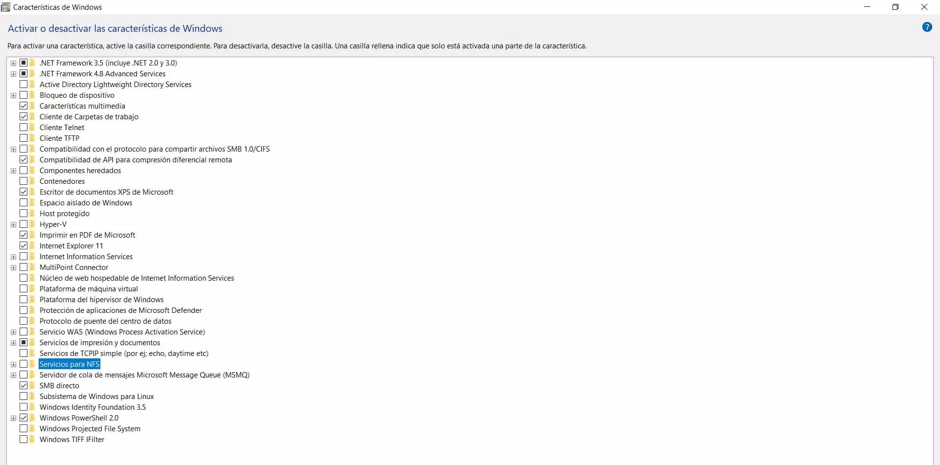 En el caso de Windows 10 hay que habilitar el Cliente NFS. De forma predeterminada viene deshabilitado, principalmente por los problemas de seguridad que comentábamos. Es común que protocolos antiguos como este no vengan activos de forma predeterminada.